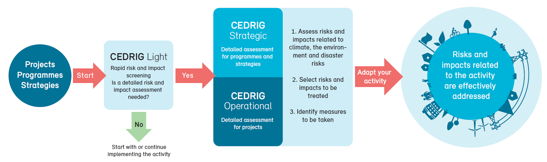 CEDRIG is divided into three modules: CEDRIG Light serves as an initial filter to determine whether an activity is at risk from climate change, environmental degradation or natural hazards, and whether it could have significant negative impacts in terms of greenhouse gas emissions, the environment or natural hazards. The results are used to decide if a detailed assessment should be conducted. CEDRIG Light takes approximately one hour and can be conducted individually.